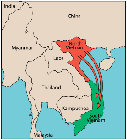 After the French lost colonial control of Vietnam in 1954, Vietnam was divided into two countries, communist North Vietnam and non-communist South Vietnam. During the early 1960s, the communist influence was increasing in South Vietnam. It became clear to the United States that this communist influence was financed by the communist North, which, in turn, was financed by the Soviet Union and China. Remember, the United States wanted to limit communist expansion.