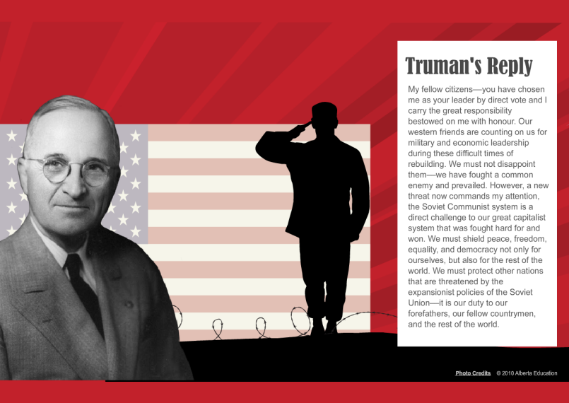 In 1947, U.S. President Truman announced that the Truman Doctrine would be applied in all countries threatened by communism. Truman declared that the American government would provide military and economic aid to any country threatened by communism. This way, the Americans could contain and limit communist expansion. Economic or military aid could be provided to any country that felt threatened by the Soviets.