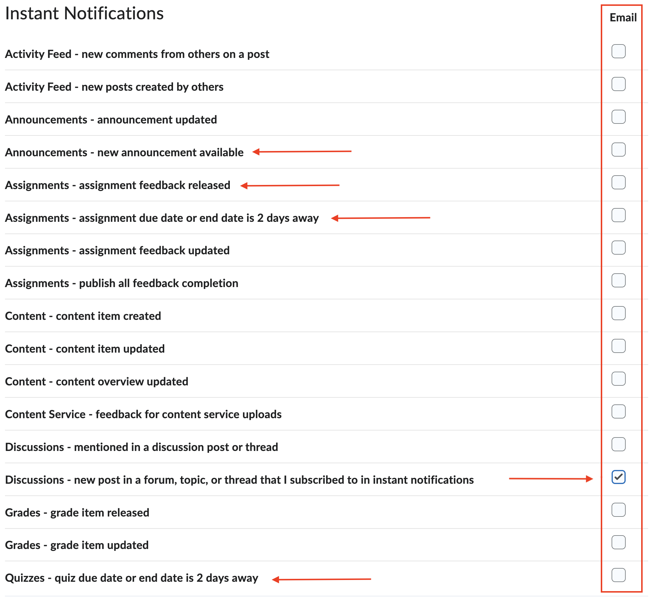 - You can add or remove checkmarks in the red box to indicate what you'd like to receive emails for.